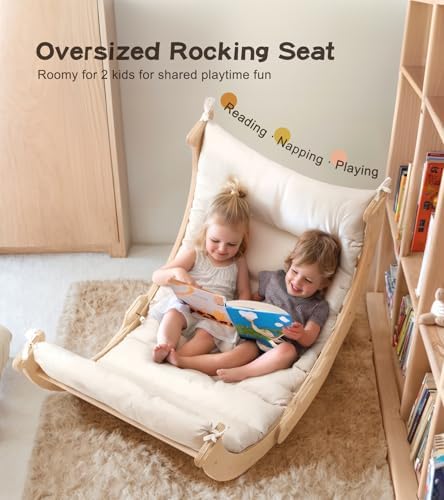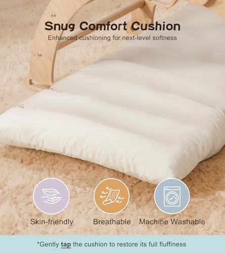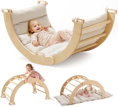 3-IN-1 MONTESSORI CLIMBER: Experience imaginative play with this adaptable climber. It serves as a sturdy climbing arch and ladder, ideal for enhancing baby’s balance and coordination skills. Flip it over to transform into a soothing arch rocker, complete with a soft cushion that ensures a cozy experience. Featuring interactive hanging toys, it can be used as a play gym to captivate babies during tummy time and aid in motor skill development