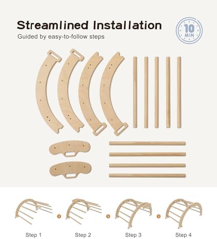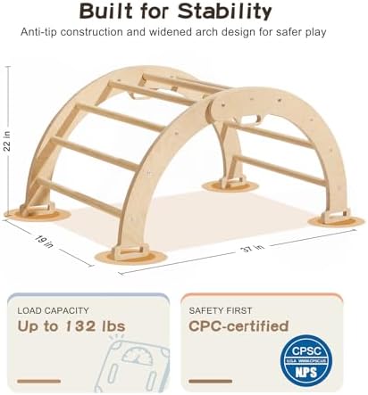 DURABLE BIRCH CONSTRUCTION: Crafted from natural birch wood, this montessori climber prioritizes durability and safety. The wood is meticulously polished to a smooth finish, featuring rounded corners that prevent any risk of scratches. It is non-toxic and odorless, providing a secure environment for children’s safe play, and offering parents peace of mind. Arch dimensions: 36.8×22.4×18.9 inches