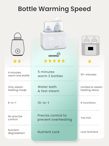 【Smart 10-in-1】Fast Steaming / Water Bath Warming/ Thaw / 24H Keep Warm / Sterilize/ Food Heating / Adjustable Timer / Adjustable Temp / Large capacity / Anti-scald Basket. This do-it-all twin bottle warmer is ideal for twin families. A double bottle warmer is enough to meet all your daily feeding needs and save space and budget.