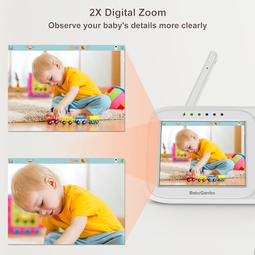 【Adjustable Camera Angle & 2X Digital Zoom】Our baby monitor with camera and audio can rotate 360° and tilt 120° up & down. So you can manually adjust the camera angle for best view. The video baby monitor’s 2X Digital Zoom feature allows you to see details more clearly when watching your baby.