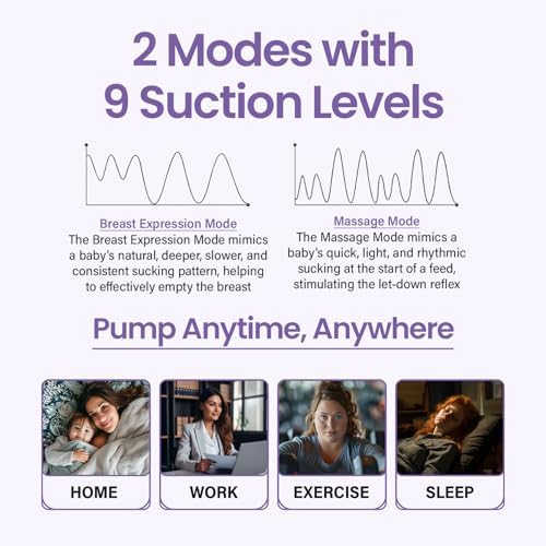 Smart Adjustable Suction: Features two modes for optimal comfort and efficiency: Pump Mode: Mimics a baby’s natural sucking rhythm to help extract milk efficiently. Massage Mode: Stimulates milk flow for a more comfortable and pain-free experience. Choose from 9 adjustable intensity levels using the LCD screen for easy operation. Includes memory function and an automatic 30-minute shut-off for added safety.