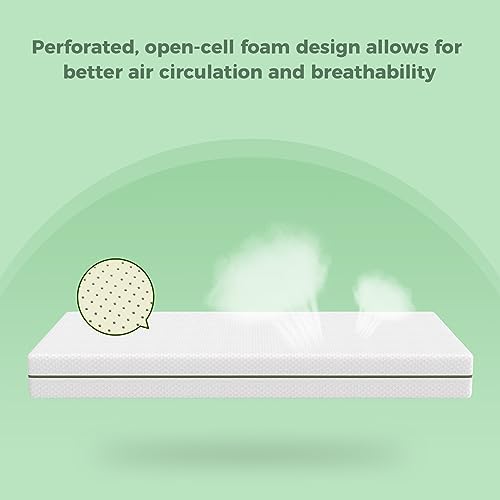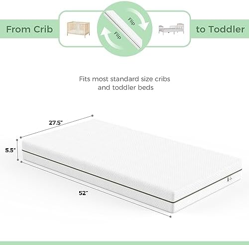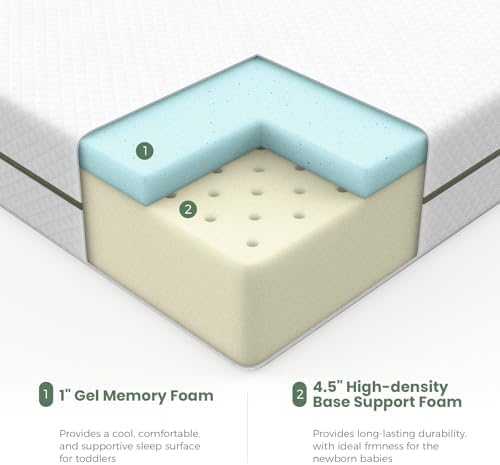【Breathable and Cool Comfort】: Our 2-in-1 crib and toddler mattress is designed with your baby’s well-being in mind. It showcases a breathable knitted cover, gel-infused memory foam, and perforated open-cell foam, promoting optimal air circulation and cooling technology that effectively dissipates unwanted heat from the body;Your baby will revel in a cool and comfortable sleep environment, guaranteeing restful nights;