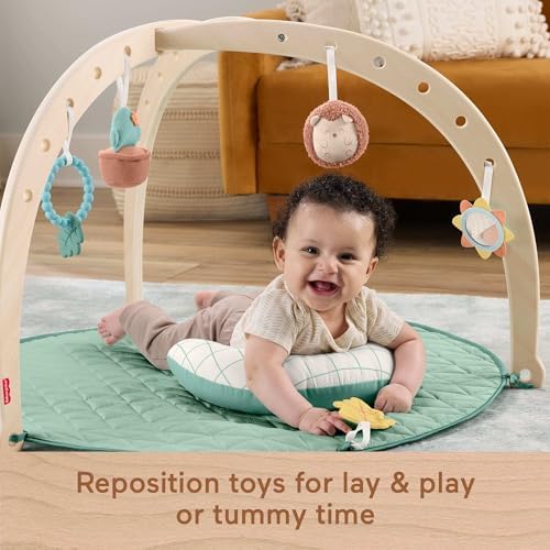 The Fisher-Price Wooden Lay & Play Deluxe Activity Gym offers newborns a variety of sensory activities to explore as they grow from lay & play to tummy time. This stylish baby gym features a wooden frame made with wood from Forest Stewardship Council-certified sources (FSC-N004566), a machine-washable playmat, a supportive tummy time wedge, and 5 developmental toys for little ones to squeak, rattle and teethe. Easily repositionable, the toys can be attached to the frame for lay & play or to loops on the playmat for tummy time fun. Colors and decorations may vary.