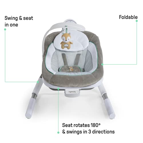 The Ingenuity AnyWay Sway Portable Swing gives your little one a cozy place to sit, snuggle, and sway. This fully-loaded baby swing is a great baby shower gift from the #1 Manufacturer of Baby Entertainment*. The swing rotates 180°and swings in 3 directions, helping baby stay soothed while in sight. Third-party tested and approved, pick between 2 modes with soothing vibrations: calming swing or stationary seat with 2 reclining positions. A pivoting toy bar with a fox plush toy helps capture baby’s attention. A removable headrest supports newborns, and the quiet swing motor helps baby stay undisturbed. The GentleTouch control pad allows you to play 19 different melodies including nature sounds and white noise at your choice of volume without pressing buttons. Music automatically shuts off after 20 minutes. Choose between a 30, 45, or 60-minute swing timer with auto shut-off at 2 hours. Plug in the unisex AnyWay Sway using the battery-saving electric USB cord (wall adapter NOT included). A compact, foldable design makes the swing easy to store and transport. Use from birth to 9 months or up to 20 pounds. (*Circana, Retail Tracking Service, U.S., Entertainment products, dollar sales, Jan-Nov 2023 combined)