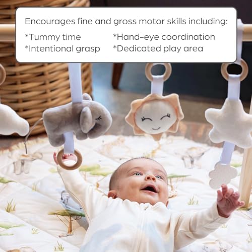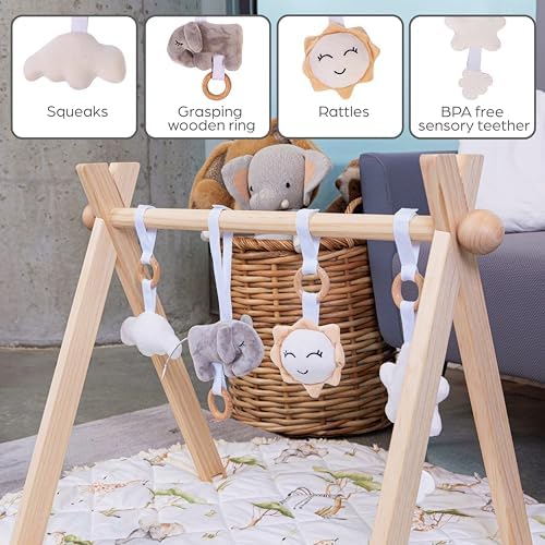 ENHANCE YOUR BABY’S DEVELOPMENT (0-12 MONTHS) — Premium wooden activity gym includes 4 detachable Montessori-inspired toys for sensory exploration, Promotes hand-eye coordination & motor skills, Perfect height for batting & grasping, Supports cognitive development through multi-sensory engagement