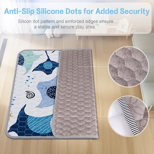 Non-slip and Non-toxic for Safety – Our baby play mat is thoughtfully designed to prioritize your child’s safety. The bottom features a high-density silicone dot pattern, providing excellent grip and stability during active playtime. Rest assured knowing that your little one can move and explore with confidence. Additionally, the mat is crafted from non-toxic and odorless materials, ensuring a hygienic and safe play area for your baby to roam freely without any harmful chemicals.