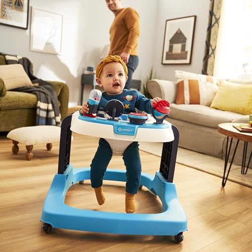 First steps are easier with our Ready, Set, Walk! DX Developmental Walker. Your little one can stretch their legs while being entertained with toys that provide sensory and tactile stimulation, and help develop gross motor skills and problem solving. The 3-position height adjustment supports the growing height and size of your child, all while encouraging first steps. Plus, the extra-wide base provides added stability.Our child walker provides multiple developmental activities and 12 different songs designed to amuse and delight, while stimulating babys visual and auditory senses. It includes a large tray thats great for snacks, with plenty of room for baby to play with toys. Theres no need to worry about messes with the easy-to-remove, machine-washable seat pad. The baby walker nests and locks together into a compact shape for storage or trips away from home. With a weight range up to 30 pounds, its an excellent option for babies getting ready to walk.The Ready, Set, Walk! DX Developmental Walker is for a child who can hold their head upright unassisted and who is not able to walk or climb out of the product.