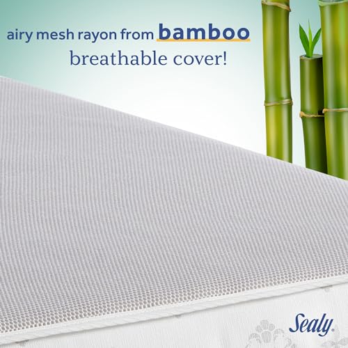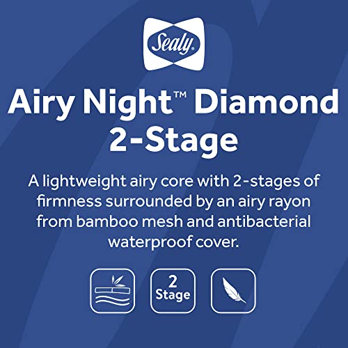 The Sealy Airy Night 2-Stage Infant Crib Mattress and Toddler Mattress is a grow with me 2 stage dual firmness baby mattress. Not only is the inside of this crib mattress designed with a grow-with-me extra firm side and a cozier side, but the cover is also designed in a special way. The mattress cover offers a rayon from bamboo mesh that is breathable on baby’s skin and silky smooth fabric with open air pockets. The toddler mattress side is slightly softer and features an exclusive waterproof antibacterial surface. The Staph-Gard antibacterial surface was tested in a laboratory to help ensure harsh bacteria would not spread across the crib mattress surface while still being gentle on baby. Waterproof surfaces are essential for any baby mattress to maintain a cleaner, more sanitary sleeping environment for babies. Our exclusive fiber core uses hypoallergenic, airy cushioning throughout, made with a sustainably-sound materials, produced in the USA. The entire core is surrounded by a natural cotton wrap and the square corner design fits snugly inside your baby’s crib. Sealy crib mattresses are baby beds designed to fit all USA standard full size cribs and toddler beds. Lightweight standard size crib mattress fits perfectly in any standard size crib – measures 52x28x5.5 inches. Greenguard Gold Certified for a healthier indoor environment, passes Chemicals of High Concern to Children from various U.S. state regulations that test for over 80 harsh chemicals in children’s products, passes ASTM crib mattress standards especially important for a snug, safe fit, passes CPSIA standards which ensures no additives like lead or harsh phthalates are used. Sealy was voted America’s Healthiest Crib Mattresses, winning the 2020 Cribsie Awards. Includes a lifetime warranty on workmanship and materials.More babies sleep on a Sealy than any other crib mattress brand, making Sealy America’s #1 Brand. Best, safest crib mattress and a baby registry must haves!