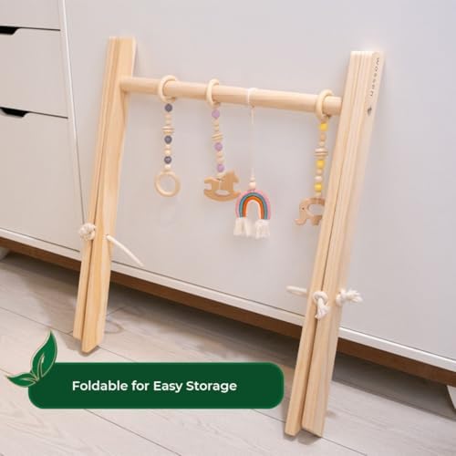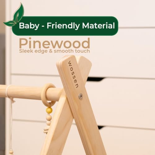 Natural Wooden Toys: Wossen Baby PlayGym Set draws attention with its natural wooden toys. Designed with your baby’s safety and health in mind, these toys are environmentally friendly while improving their tactile and visual perception.