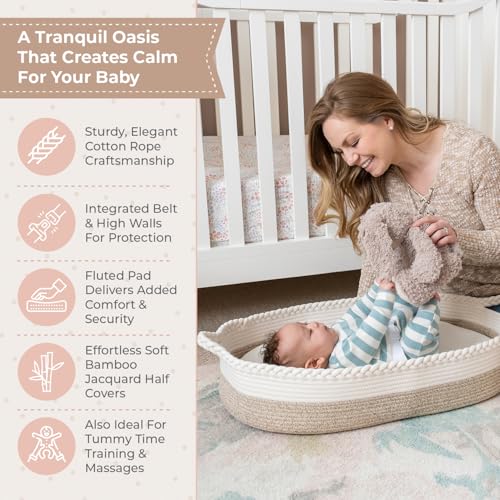 ✅ THE PERFECT BALANCE OF COMFORT, FUNCTIONALITY & STYLE: The 30″L by 17″W by 6”H nursery basket features a secure safety belt and a gentle PU foam pad that cradles your baby’s back; Also, the baby changing pad basket includes an extra luxuriously soft & waterproof bamboo jacquard cover